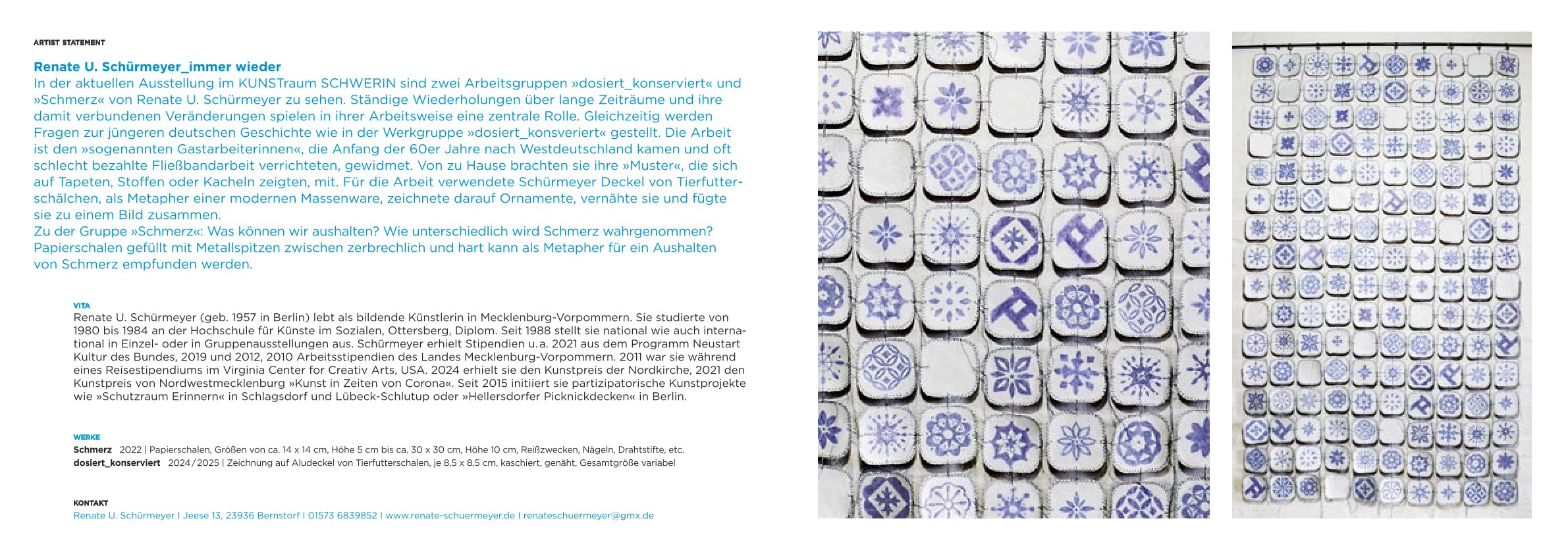 In der vierten Ausstellung "immer wieder" vom 13.11. – 18.12.2025 werden Werke der Künstlerin Renate U. Schürmeyer gezeigt. Am 12.11.2025 um 18 Uhr feiern wir die Eröffnung der Ausstellung „Renate U. Schürmeyer – immer wieder" in der Reihe „CORNER KICK_OFF: [Eckanstoss]“. In die Ausstellung führt die Kunstwissenschaftlerin Annekathrin Siems ein.