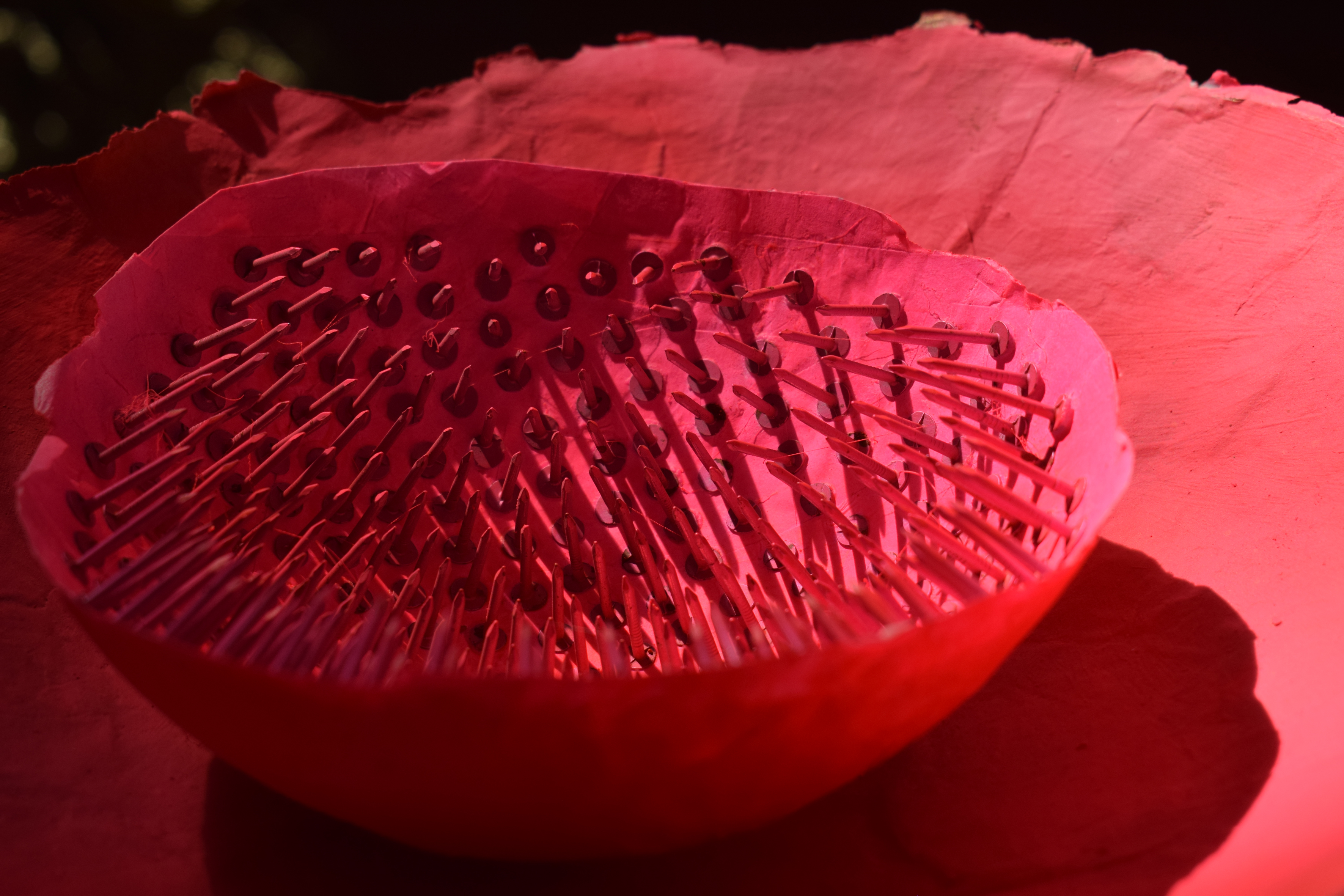 Renate U. Schürmeyer_Schmerz_2022 | Papierschalen, Größen von ca. 14 x 14 cm, Höhe 5 cm bis ca. 30 x 30 cm, Höhe 10 cm, Reißzwecken, Nägeln, Drahtstifte, etc.