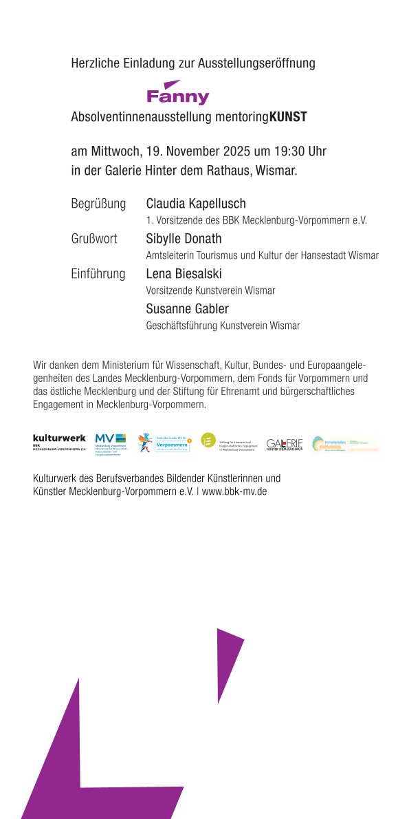 Am 19.11.2025 wird die Abschlussausstellung der Absolventinnen des 6. Durchgangs des Projektes mentoringKUNST in der Galerie hinterm Rathaus in Wismar feierlich eröffnet.