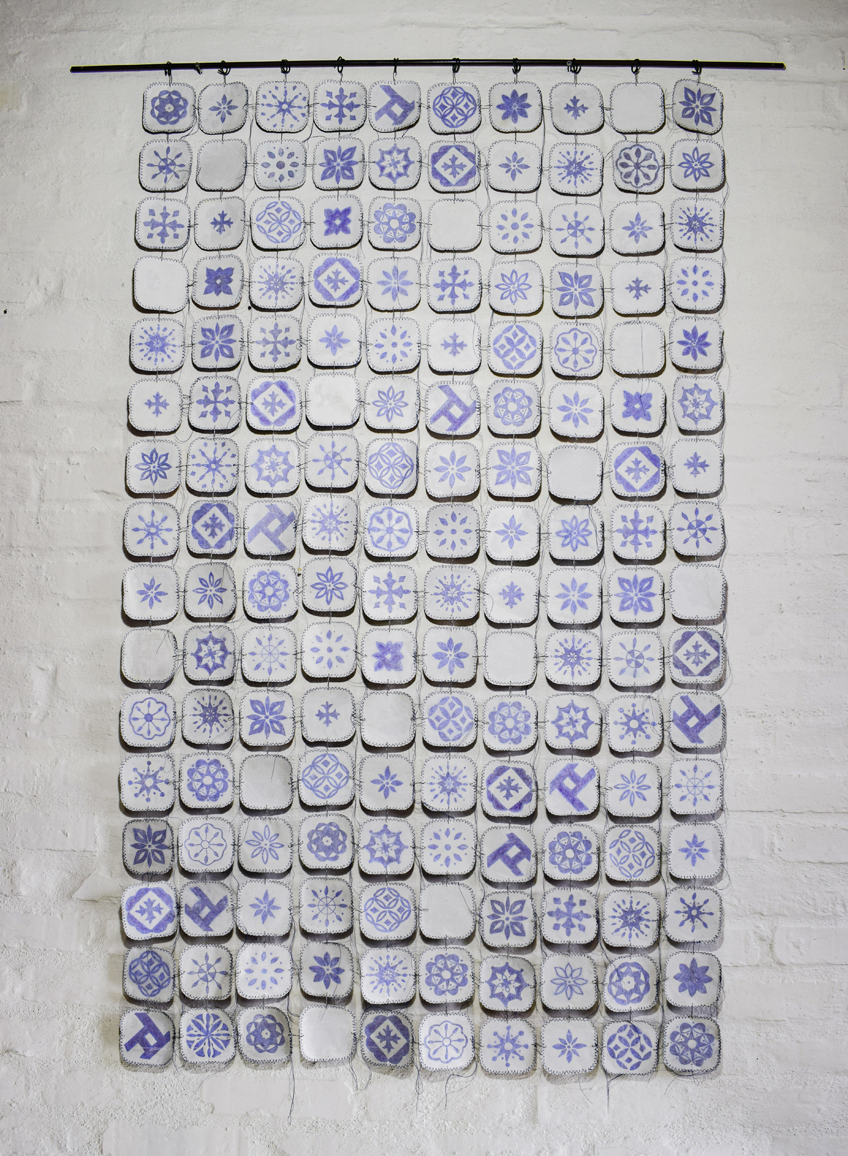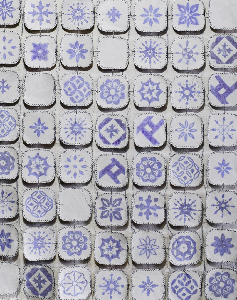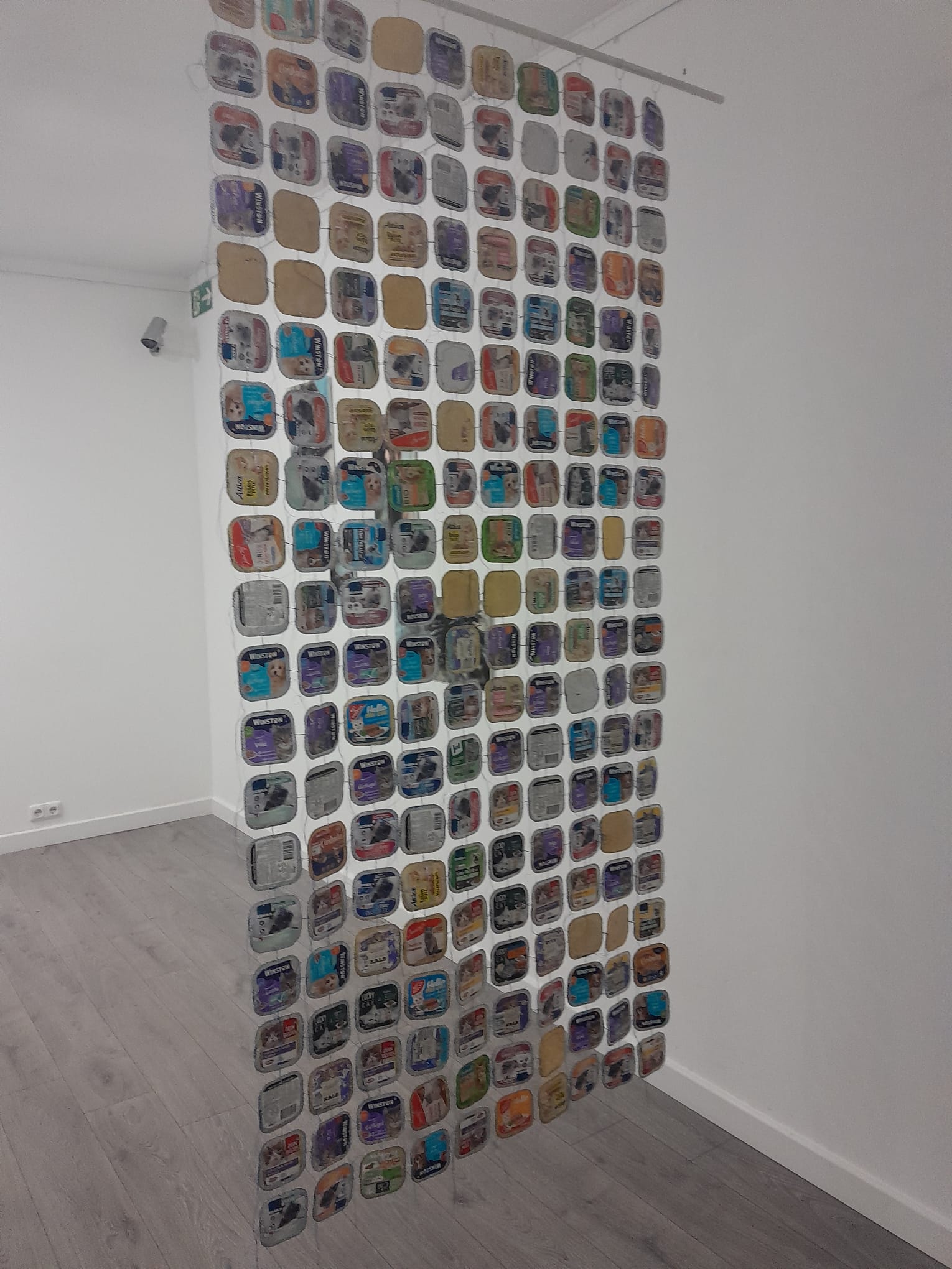 dosiert_konserviert 2024 / 2025 | Zeichnung auf Aludeckel von Tierfutterschalen, je 8,5 x 8,5 cm, kaschiert, genäht, Gesamtgröße variabel